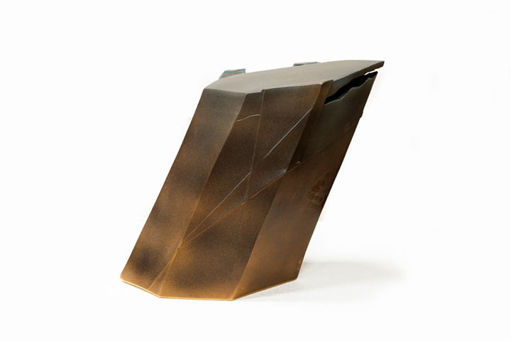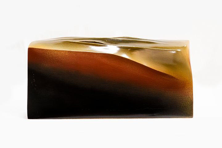 斜に立ち上がる陶のフォルムは、鋭く切り立った面で構成され、厳しくもあり、シャープでもある。上部側面の開けられた隙間も、一つの表現効果となっている。全体として自然のイメージを再構築する作者の鋭敏な感性が光る。