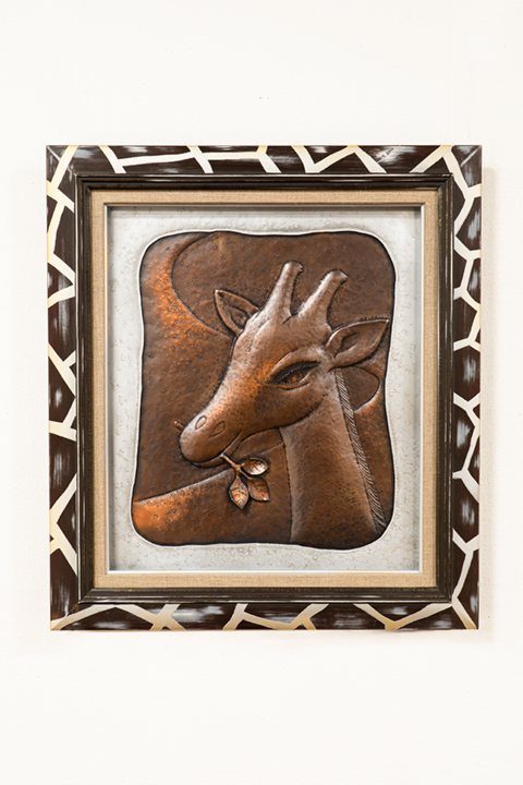 鍜金のパネル、キリンの上部を金属板でレリーフ状に打出し、優れた技法により表現した作品。額も効果的に工夫を凝らし現代感覚溢れる銅板の作品です。