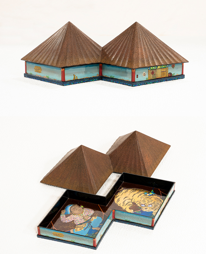 漆の塗り、蒔絵を駆使した作品。家の形でしょうか、屋根の形を蓋にして、家の中に虎や行者を蒔絵の技法で表現。螺鈿や細密を蒔絵による小品ながらも労作です。