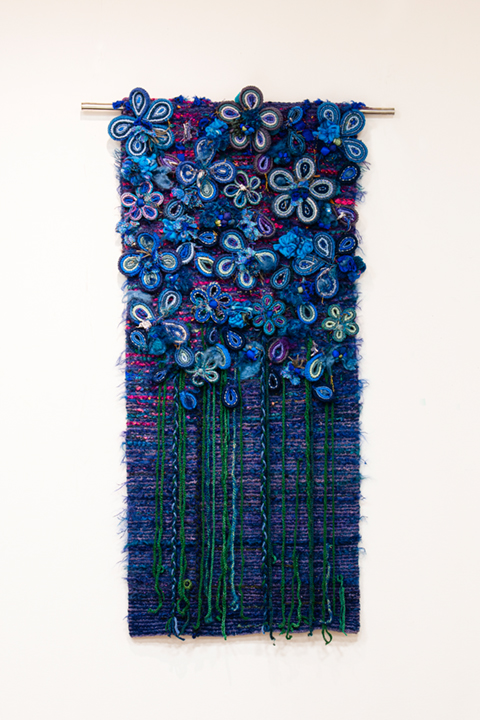 濃紺の糸を使った織の作品。深い森の中の雰囲気の中に咲いた美しい花々を表現したタペストリー。紺系の糸と花の色の糸がマッチした優れた作品です。