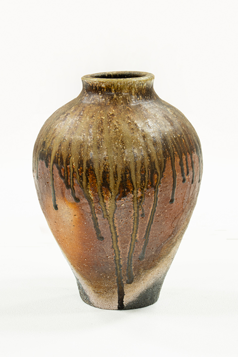 天に向かって力強く飛び立とうとする器のフォルムは力強く、凛々しい。自然釉のたっぷりとかかった釉調がそのフォルムを際立たせている。